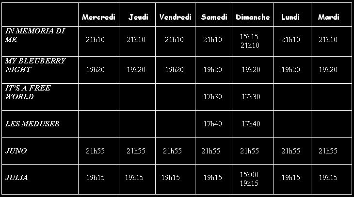 programme Programme du 09/07/2008 au 15/07/2008 Résumé de nos films In Memoria Di Me My Blueberry Night Les Méduses It's A Free World Juno Julia